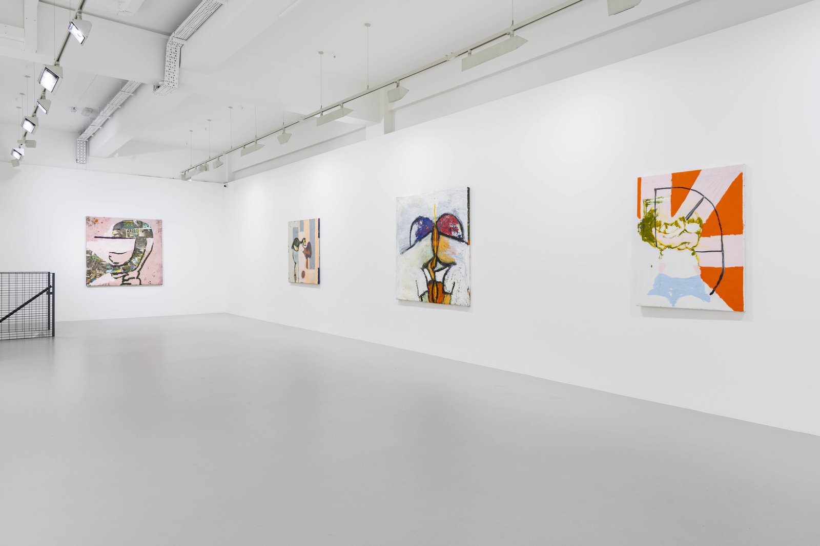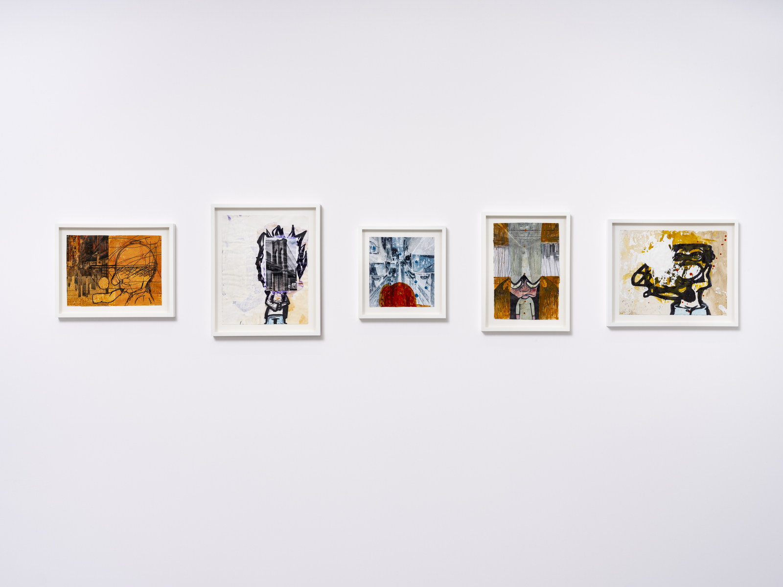 The new paintings are a little less visceral than previous works, where the paint sometimes feels like it has been coerced into intestinally tight twists and turns. These works, while smaller in scale, are more spacious – the figures have softer edges, the colour palette is more muted. Some of them they have a hazy, almost dreamy quality. Call it the other side of the mirror; call it being spaced out. Where the recurring figures that he used to call ‘minions’ in older series of work are all body – oral fixation and base desire – there are heads everywhere in the Nodes paintings. Sometimes they’re attached to a body; sometimes they implicate the whole of the canvas. That makes sense: since lockdown, we’ve all spent more time in our own thoughts. These works are a reminder that painting, as a process, is both physical and cerebral. They are paintings in the gutter, looking at the stars.