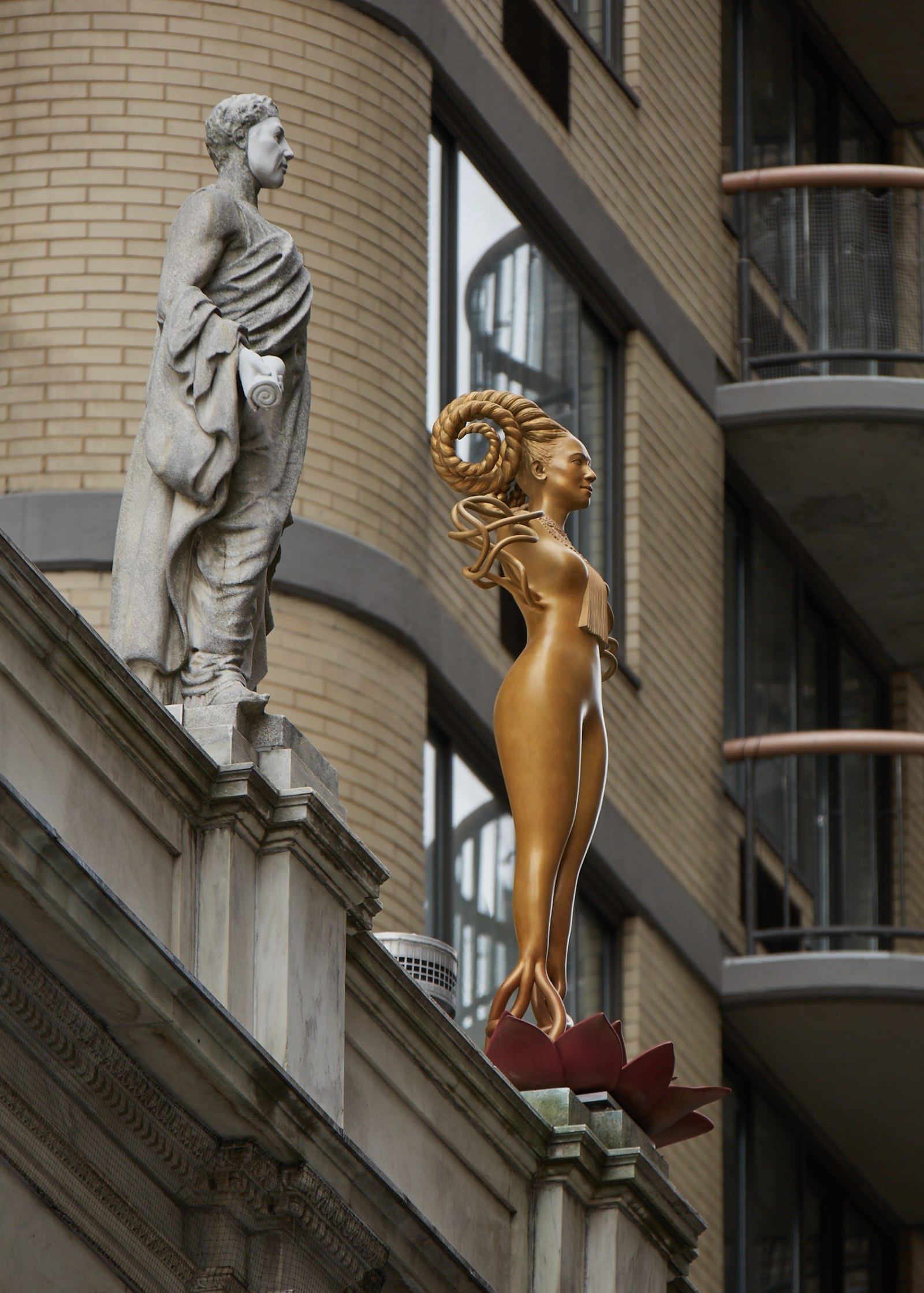 Installed on the rooftop of the Courthouse, and visible from the street, is Sikander’s sculpture NOW (2023). Rising from the base of a lotus plant (a symbol of wisdom), it is the first female figure to be installed amongst the sculptures of nine male legislators, including Confucius, Justinian and Moses.