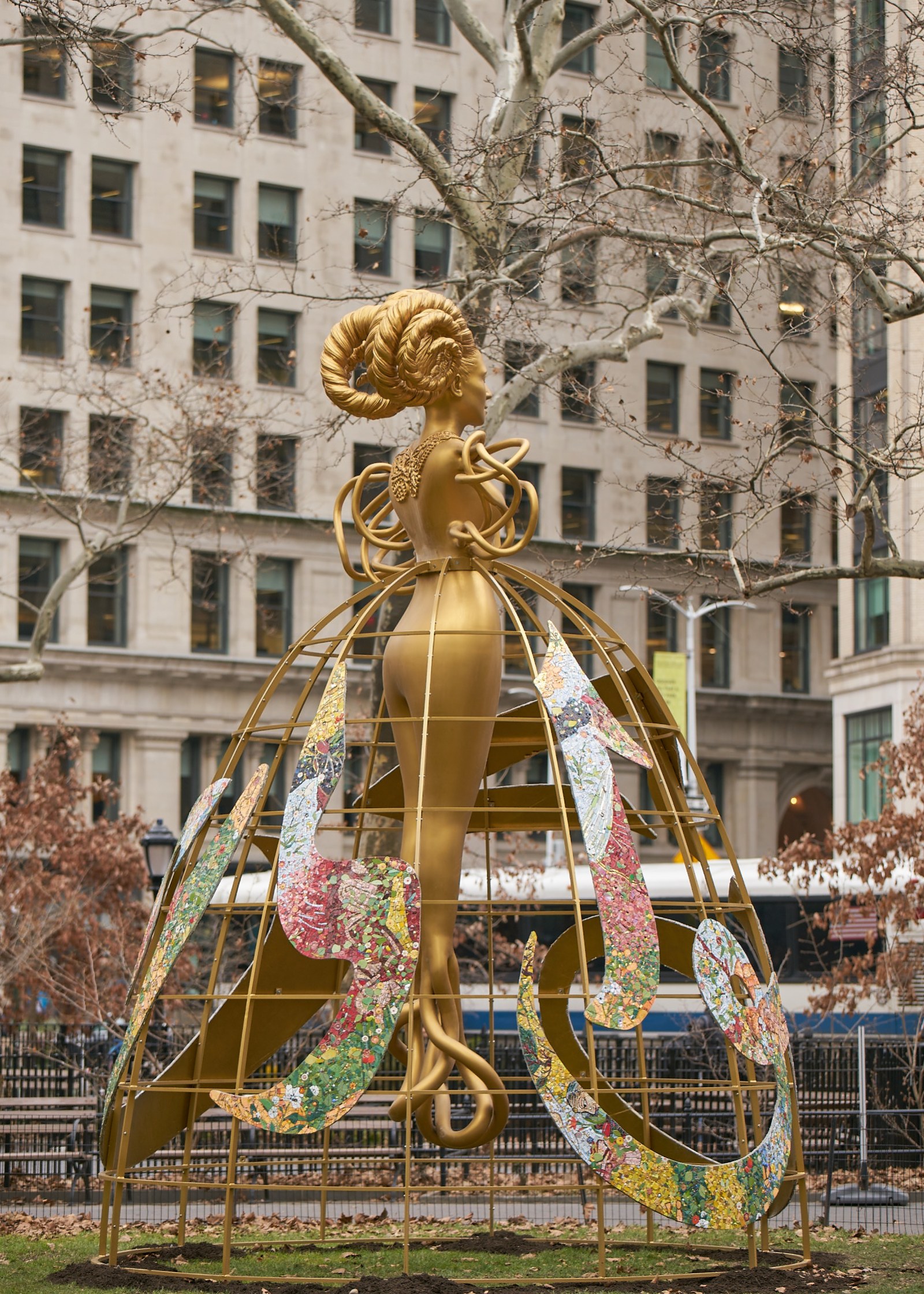 The exhibition marks the artist's first major, site-specific outdoor presentation in sculptural form. In Madison Square Park, Sikander’s towering golden female figure, Witness (2023), is embellished by a steel hoopskirt with calligraphic mosaic details, inspired by the domed stained-glass ceiling of the historic courtroom, with its leaded lines that resemble the longitudinal and latitudinal lines on a globe – a proclamation of the figure's authority in the world.