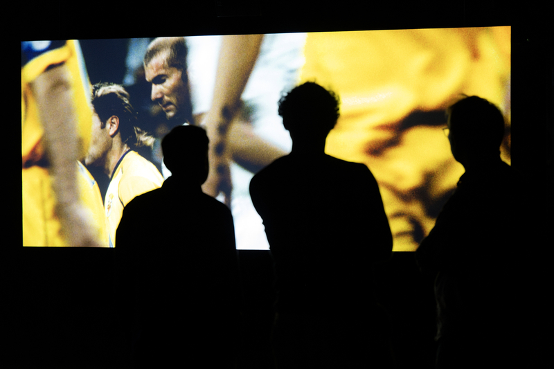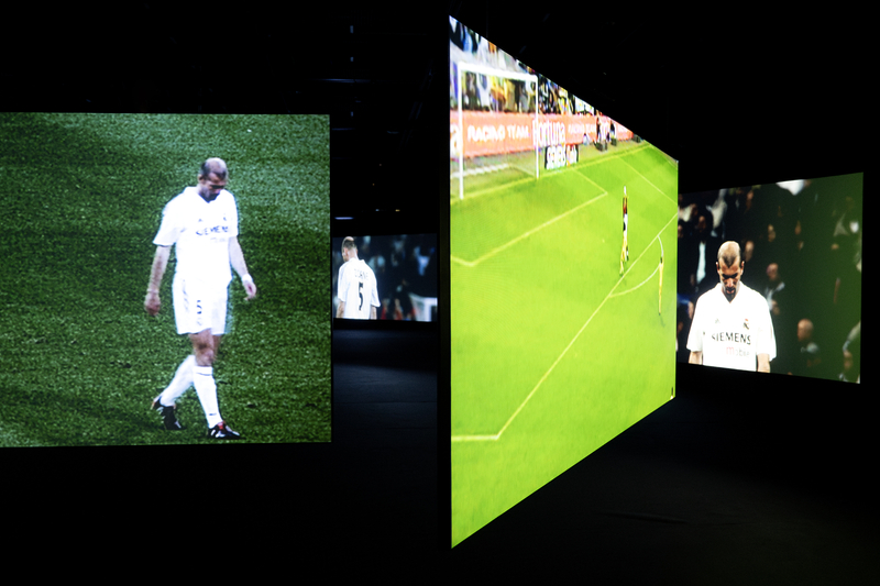 Featuring 17 screens suspended throughout the exhibition space, the installation draws the visitor into a sensory journey of images and sound. Zidane’s breathing, his inner voice, the sounds of clashes on the field, the chanting of the crowd, the noises of bodies colliding, of the ball being struck… All of this sound material, combined with original music by the Scottish post-rock group Mogwai, makes up the masterly score.