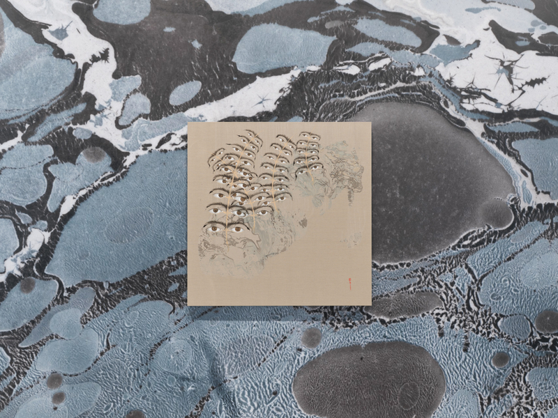 Within this body of work, Kahraman examines the critical tensions at play in Linnaeus's publication: between the symbolic use of marbling, a monoprint used to prevent theft and re-appropriation, and the explicit erasure of the cultural heritage and knowledge of marginalised peoples. Here, the artist experiments with marbling her own handmade linen surfaces using the ebru technique, which translates as 'the art of clouds'. Inhabiting their intentionally irregular landscapes, Kahraman's defiantly anonymous female figures traverse and challenge grid-like systems designed to impose order and identification. In Kahraman's hands, the technique of marbling becomes an act of defiance, a means of building alternative architectures of refuge and resilience.