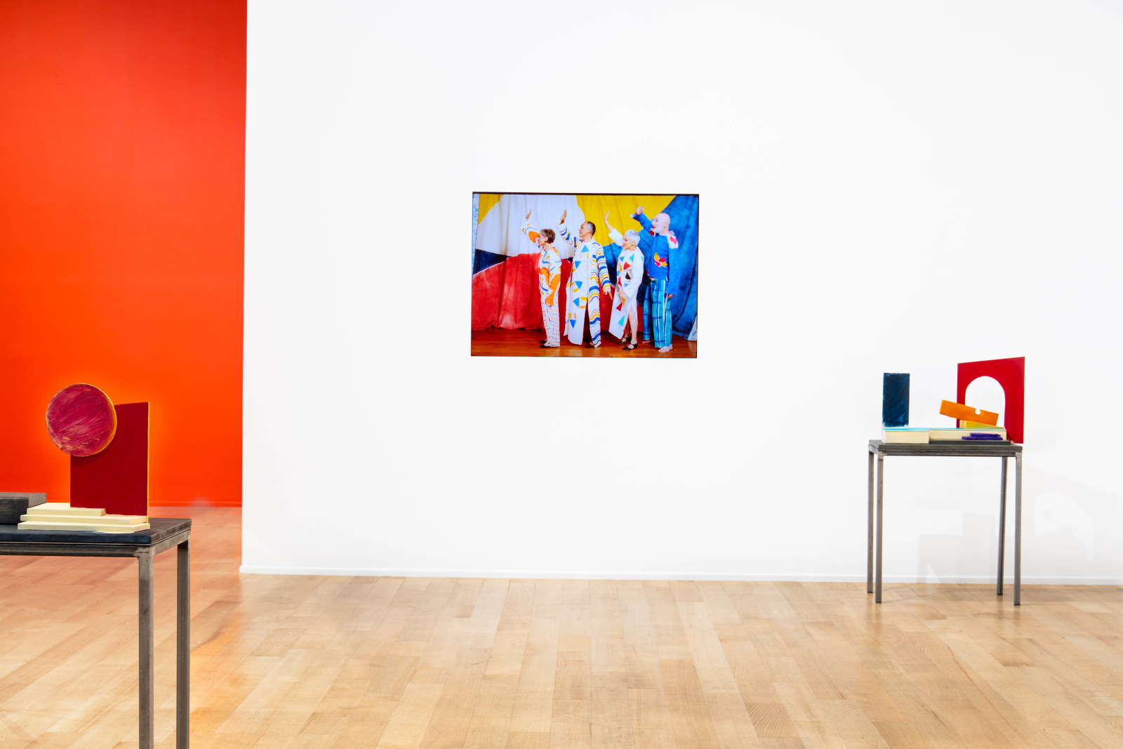 Ulla von Brandenburg: In Dialogue explores this cross-generational engagement with geometric abstraction—its interplay of circles, squares and triangles—evident in both Adnan’s mural and von Brandenburg’s practice, and staged alongside the rich history of the Russian-French artist Sonia Delaunay. Here, Adnan’s lyrical abstract mural (Untitled, 2023), at 14 × 21 feet, serves as both a protagonist and theatrical backdrop in von Brandenburg’s exhibition scenography. The works interweave through the language of abstraction and the artists’ shared interests in the social and spatial environment.