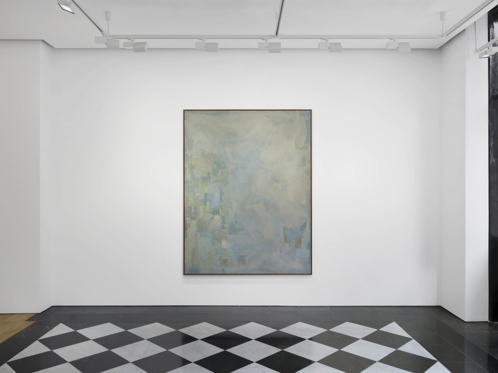 Dark oxygen (all works 2024) evokes a moonlit landscape, with patches of cool lilacs and silvery blues and greens. Touches of rust and warm colours mark the edges, while the whole painting seems to be embraced by a quivering penumbra. If Dark oxygen has a wintry chill, a sense of abundant, generative life characterises the surface of My desire is not a thinking. In a haze of peachy orange, as if bathed in the light of a sunrise, sections of paint emerge on the canvas like patches of lichen or moss, sedately moving with their own inner force or rhythm. Both paintings express a distilled and unearthly beauty, reminiscent of a mythical landscape conjured by Gustave Moreau, though fractured and emptied of narrative. At the same time, these are meditations on paint itself; each canvas a multivalent space for Ramsden to nurture the ambiguity and potential of her surfaces.