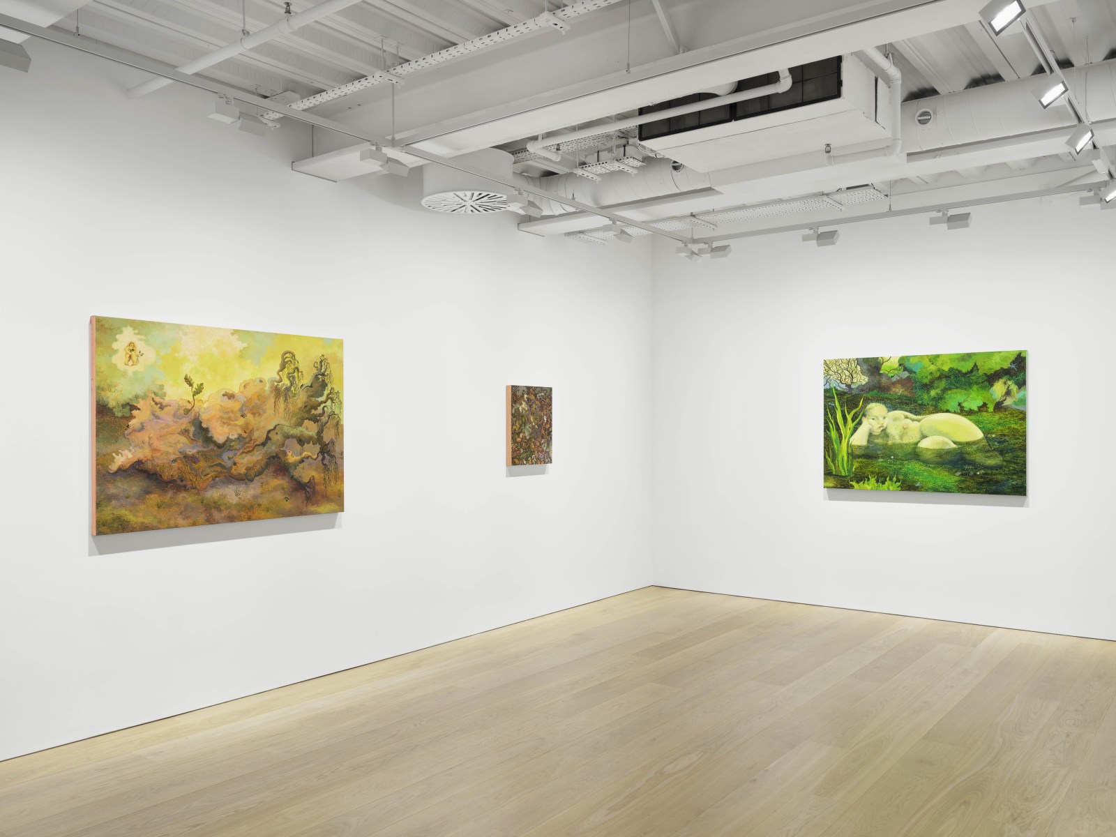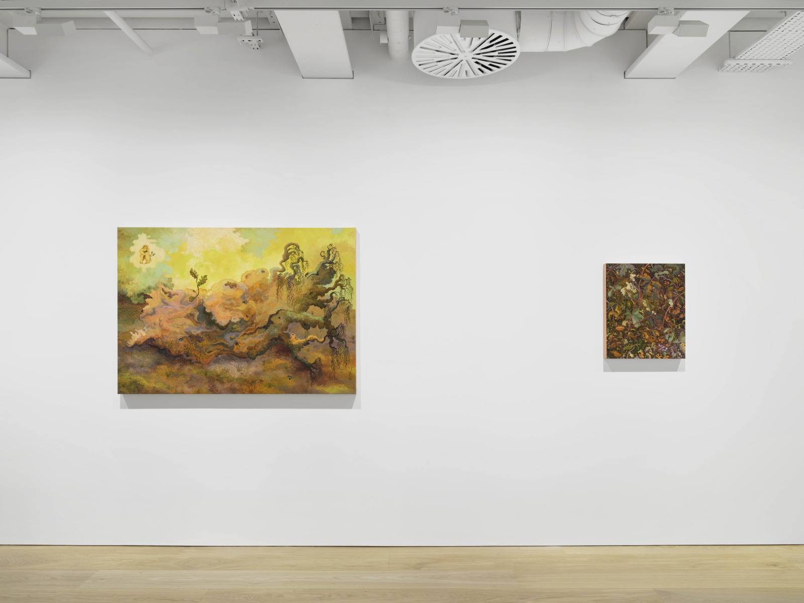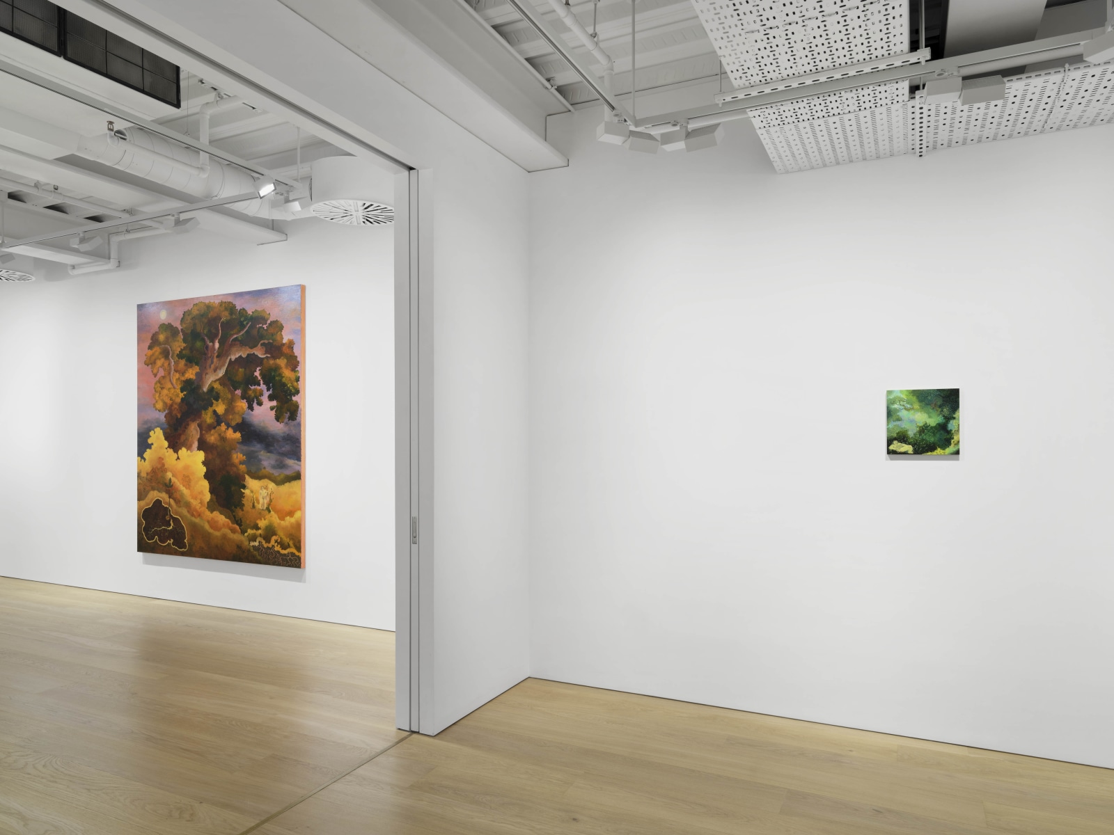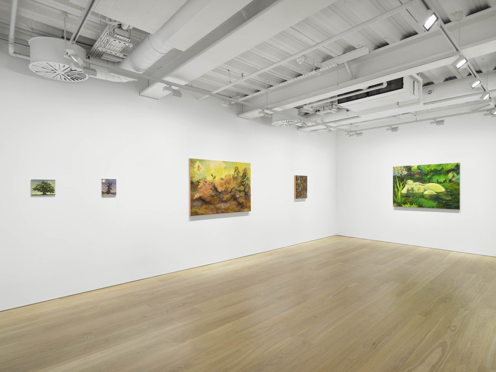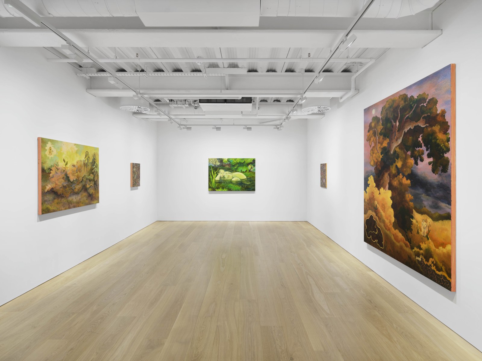 A spirit of place informs Wilson’s work. Drawing inspiration from ancient English folklore, poetry and painting, the artist depicts bountiful landscapes that exceed the natural; devoid of human presence, they are instead inhabited by wildling creatures that live harmoniously with the land. A keystone for the exhibition is the oak tree and its rich folkloric tradition. Referred to as the guardian of the forest, the oak becomes the main character in the artist’s world, enveloping the landscape and the fantastic, hairy creatures that inhabit these lands.