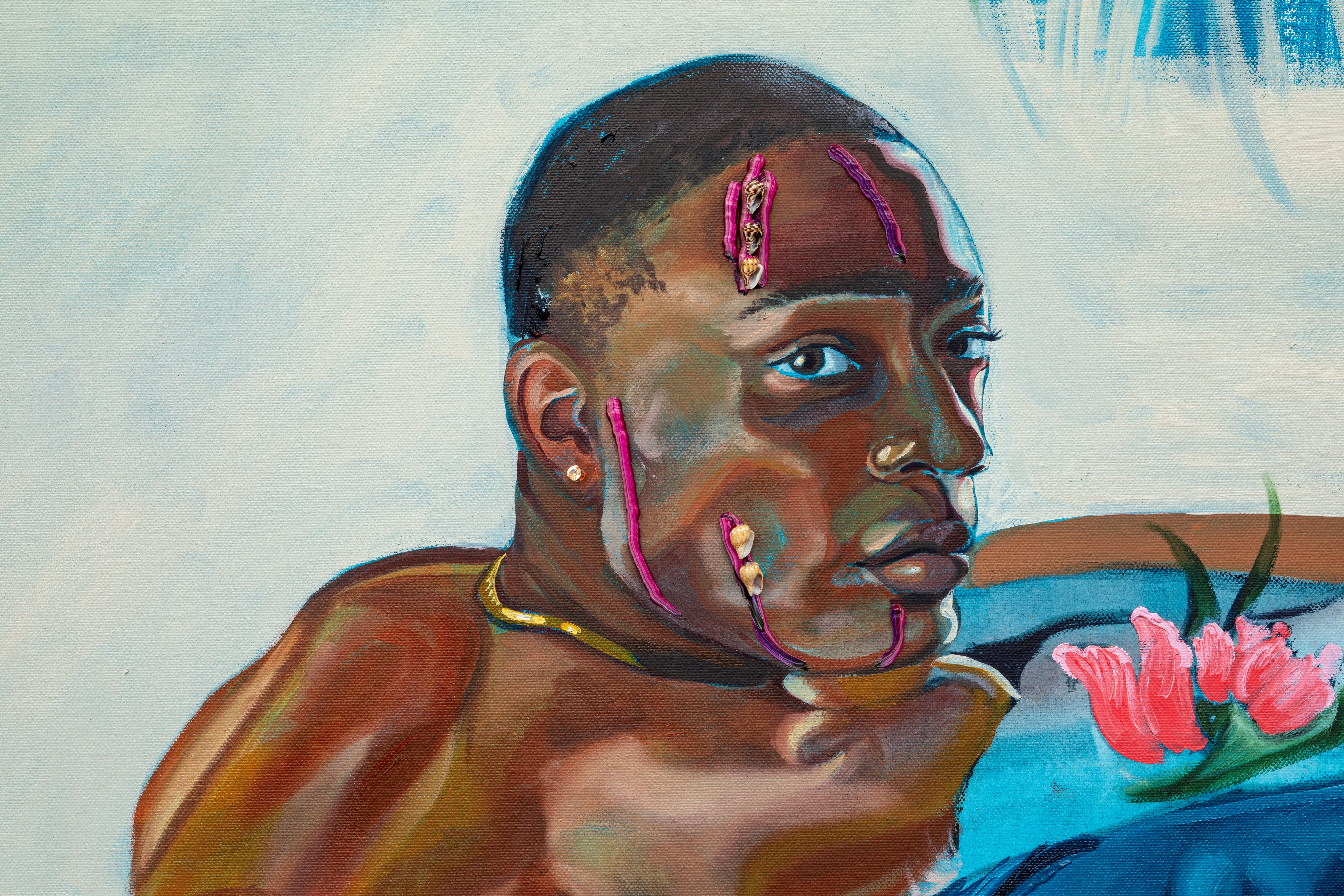 Bigger than me, the largest piece in the series presents a subject-participant, doubled, set against greenery and a sunset from Guåhan, pieces of McDaniel that find their way into her paintings. The act of doubling recalls code-switching, which for people of color can be an important survival strategy. In Bigger than me, the subject-participant seems to express the same self in two ways, rather than a private and public persona. At left, she’s fully covered in a purple jumpsuit, at right, smiling subtly, she’s nude but for a blanket. She wears pleasers, or heels made for pole dancing, that reflect the light around her. The world that McDaniel creates in these paintings is vibrant yet calming, inviting sitters and subjects to express themselves fully.